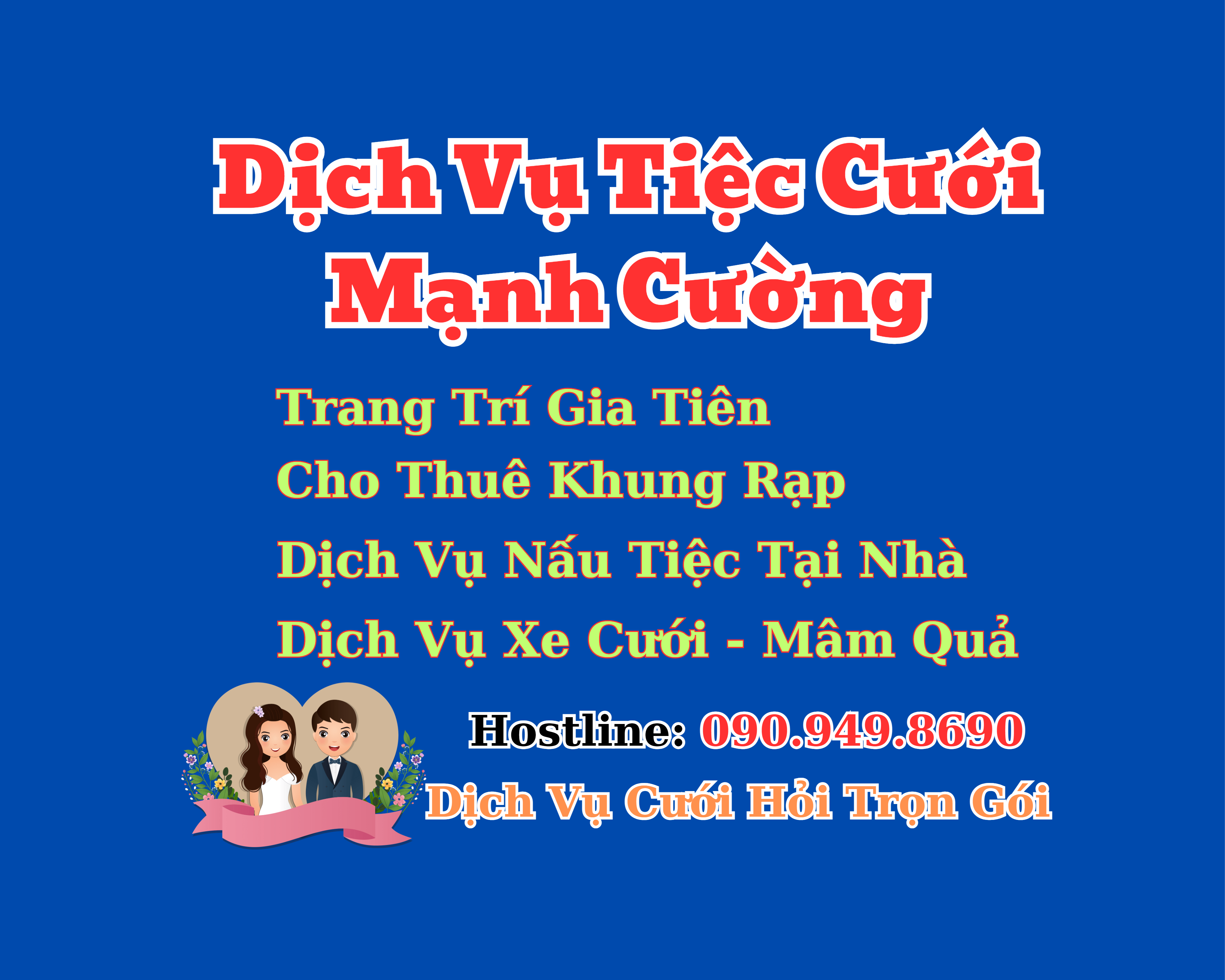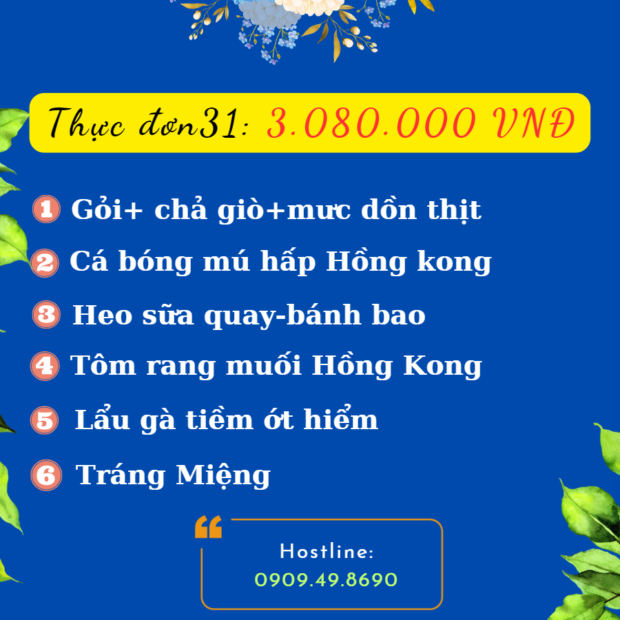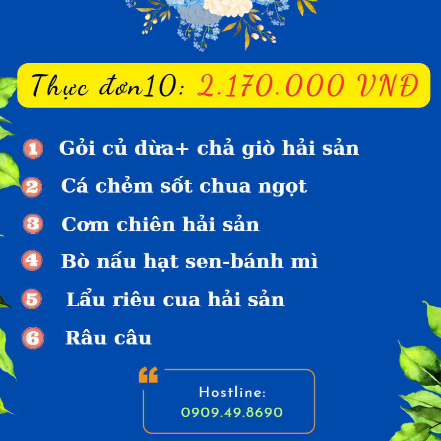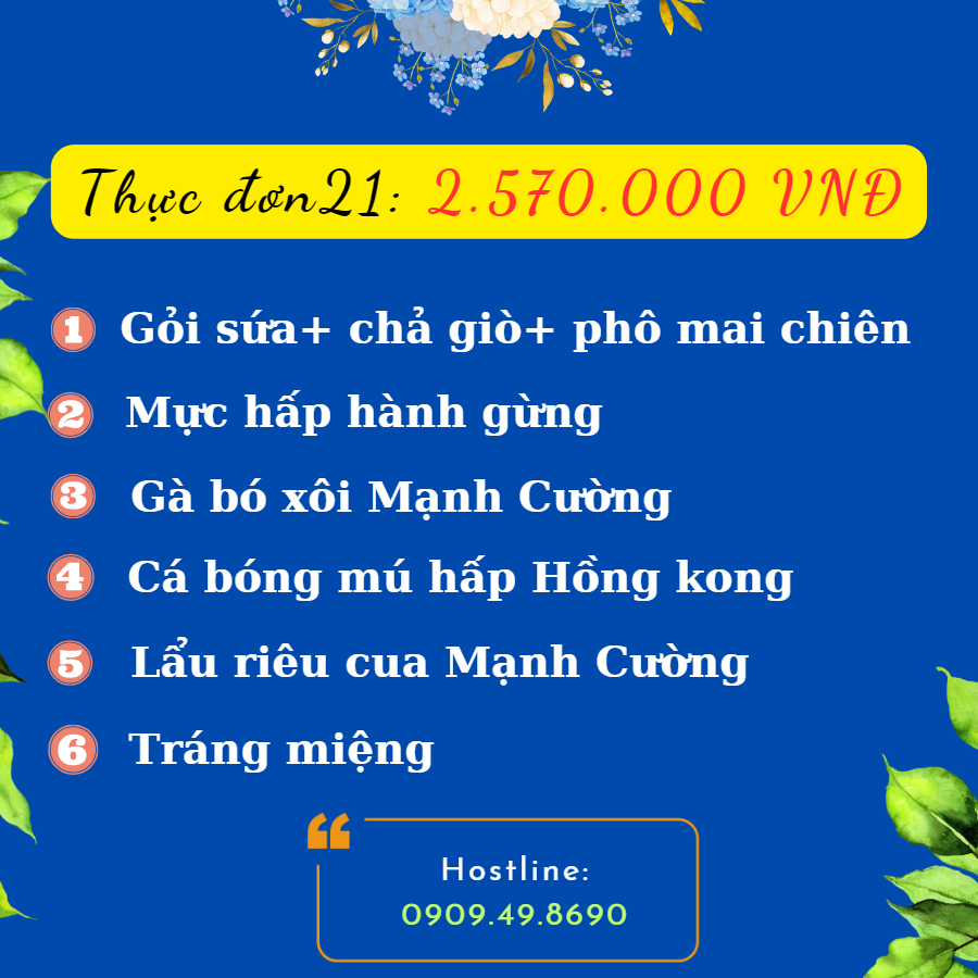 Sau đây là những thực đơn được ưa chuộng nhất hiện nay mà dịch vụ của Mạnh Cường đã lấy ý kiến từ hàng ngàn khách hàng từ dịch vụ nấu tiệc xã hòa khánh đông, dịch vụ nấu tiệc hòa khánh nam, dịch vụ nấu tiệc trị trấn, dịch vụ nấu tiệc long an đặt tiệc từ Mạnh Cường. Chúng tôi tin rằng sẽ mang đến cho quý khách một bữa tiệc hoàn hảo nhất và ấm cúng nhất!. Hostline: 0909498690